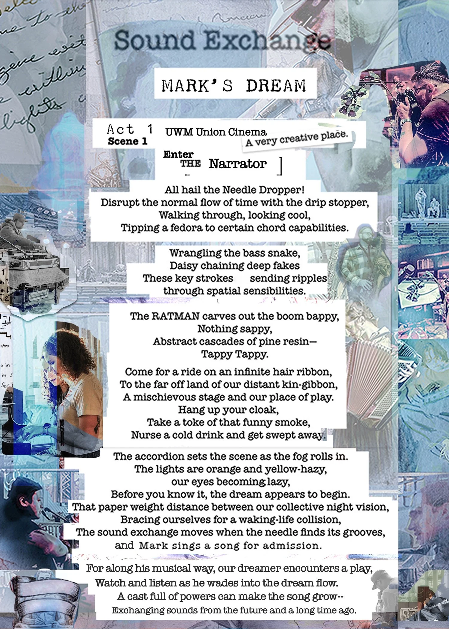 Sam Kacala is leading the charge, in dialogue with Mark Soriano, Faith Hatch, Jeff Zimpel, Maaly Napoleon, Mitch Dalzin, Efrat, Dan Kimpel, and Pete Geraci. This performance is also curated by members of the UWM Cinema team.